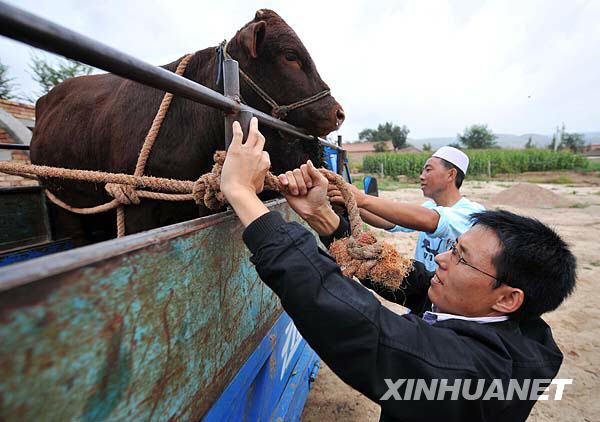 8月28日,李成(前)幫助客戶裝運肉牛。新華社記者 王鵬 攝