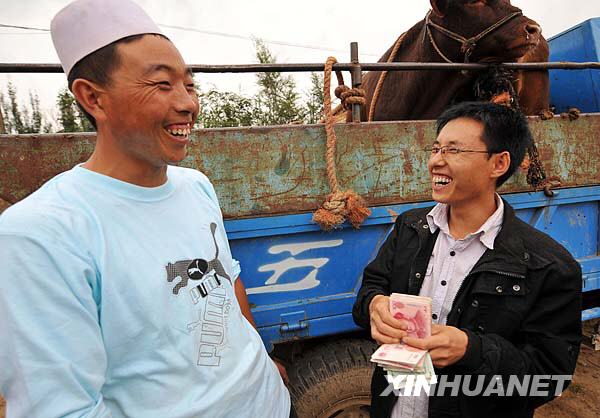 8月28日,李成(右)與客戶交易肉牛。新華社記者 王鵬 攝