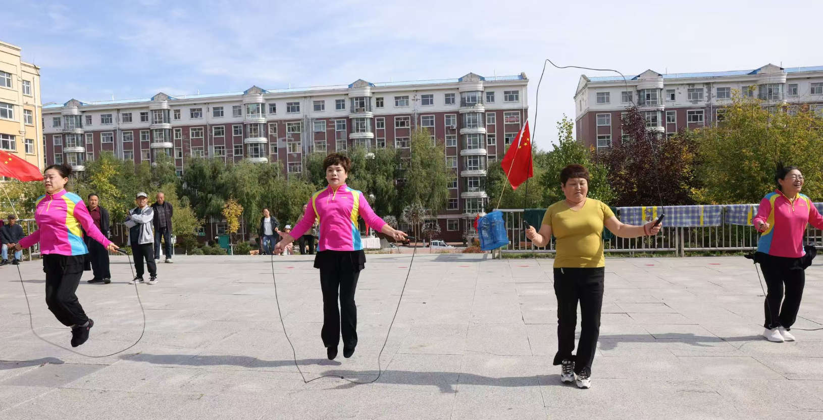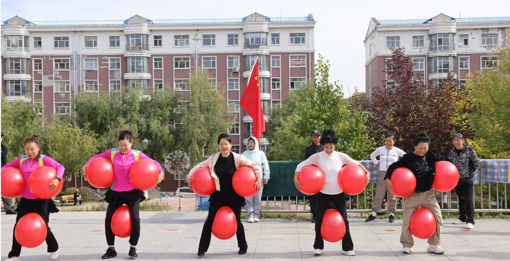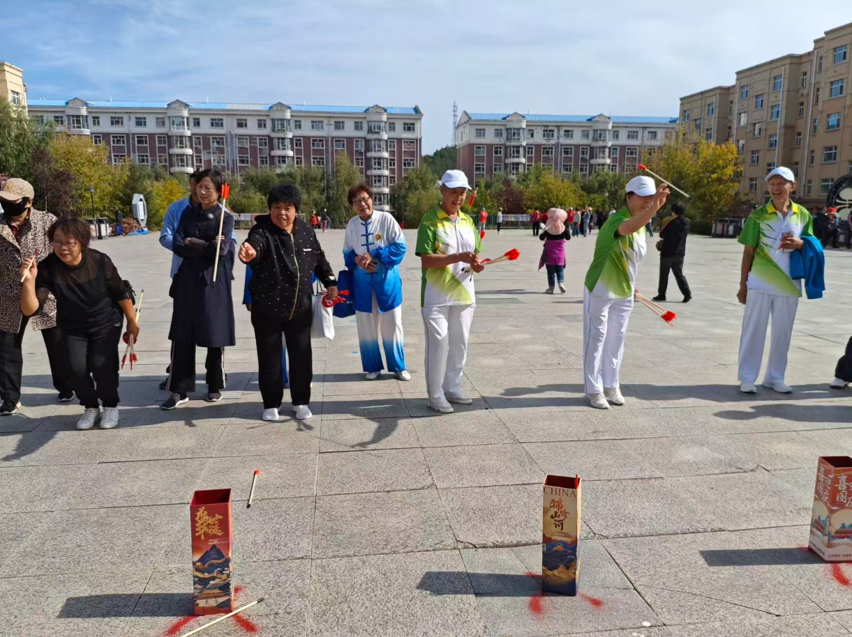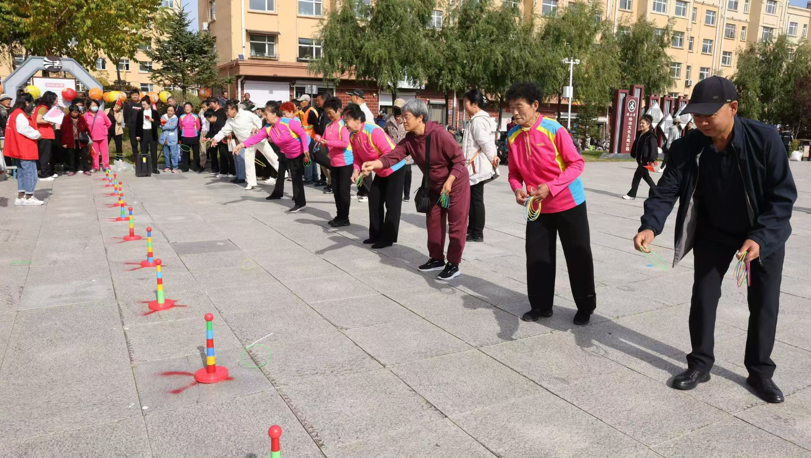 運動環節精彩紛呈:成人組的企鵝漫步、旱地龍舟趣味十足,跳繩時『我愛中國』的口號響徹廣場;老年組的套圈、投壺溫情愜意,『五谷豐登』項目盡顯活力。混合接力賽中的『掛國旗』『猜燈謎』任務融入節日元素,雙人綁腿跑、『老伙伴』夾氣球走則拉近了鄰裡距離,賽場喝彩聲不斷。