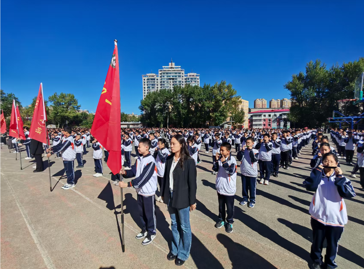上午8時,昇旗儀式准時開啟。《義勇軍進行曲》奏響的瞬間,全體師生肅立如松,目光緊緊追隨冉冉昇起的五星紅旗,胸前徽章與國旗交相輝映,校園內國歌回響。昇旗儀式後,震撼一幕驟然上演:千名學子同時舉起口琴,《我和我的祖國》旋律從四面八方匯聚,如奔騰的江河般席卷校園,琴聲悠揚婉轉,激昂澎湃,連路過的市民也駐足聆聽,眼中滿是動容。初一三班學生師赫蘭博站在隊伍裡,得格外認真:『口琴練了整整兩周,就想把對祖國的心意全吹出來!聽著三千人的齊奏琴聲,我很驕傲,以後一定好好讀書,給祖國增添光彩。』