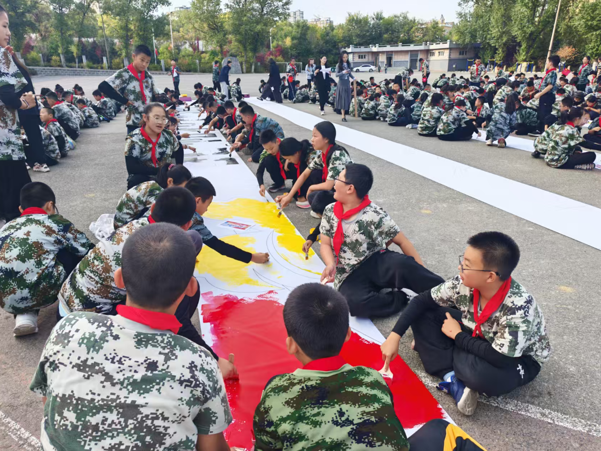 隨後,操場中央的納斯卡巨畫創作現場迅速沸騰。500名學子蹲在30米長的畫布旁,紅色顏料桶整齊排列,畫筆揮舞間,國旗的鮮紅、天安門的明黃、和平鴿的雪白漸漸鋪展。有的同學跪在畫布旁,細致勾勒華表的紋路;有的兩人一組,合力填充『我和我的祖國』幾個大字;還有人舉著調色盤來回奔走,及時補色。顏料沾了滿手、蹭到衣角,沒人在意,只專注於筆下的圖案。不到兩小時,一幅壯闊的愛國畫卷完整呈現,陽光下,天安門熠熠生輝,和平鴿似要展翅飛出畫布,路過的師生紛紛駐足拍照,驚嘆聲此起彼伏。初一五班學生王凱悅指著畫中的飛機,笑得格外燦爛:『這是我畫的!希望祖國能像這飛機一樣,飛得更高更遠,這是我們集體送給祖國的生日大禮!』